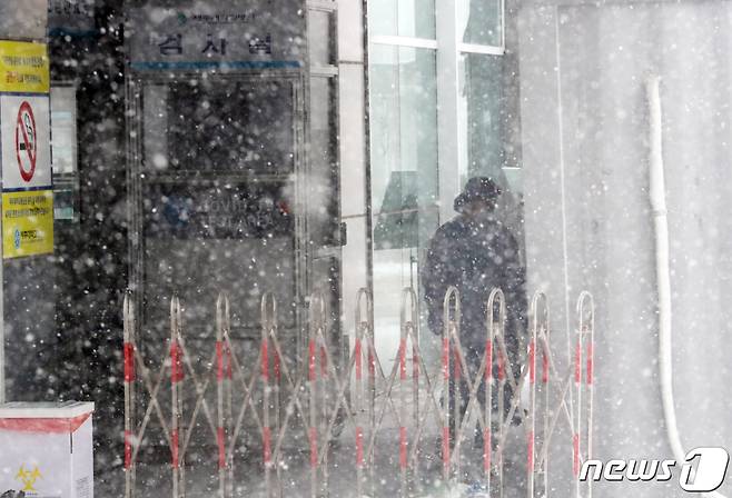 (제주=뉴스1) 오현지 기자 = 제주에 대설특보가 내려진 7일 오전 제주대학교병원 선별진료소에서 의료진이 분주히 움직이고 있다.