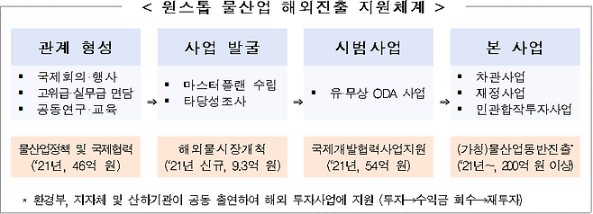 '팀 코리아 진출' 확대를 위해서는 정부 및 공공기관, 민간기업과 전문가를 한 팀으로 구성하여 대규모 사업 수주를 위해 협력하는 '물산업 팀 코리아'를 구성하는 한편, 사업 단계별 정부 지원제도를 기획하고 운영하여 '일괄(원스톱) 물산업 해외진출 지원체계'를 확립했다.