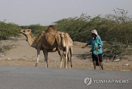epa08923838 A Yemeni shepherd walks his camels at a road in the western province of Hodeidah, Yemen, 05 January 2021 (issued 06 January 2021). EPA/YAHYA ARHAB