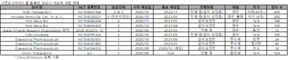 현재 ANA-001은 미국 내 약 20여곳 병원에서 약 60여명 규모 임상2·3상을 진행 중에 있다. 이 성분은 항바이러스 및 면역조절 기능을 입증했으며, 코로나19 감염 증상으로 발견되는 혈액응고 이상 현상에도 효과가 있을 것으로 기대되고 있다. 미국 과학잡지 (Antimicrobial Agents and Chemotherapy)에 발표된 전임상 결과에 따르면 니클로사마이드는 바이러스 복제를 억제하는데 렘데시비르보다 우월한 효과를 시현한 것으로 발표됐다.