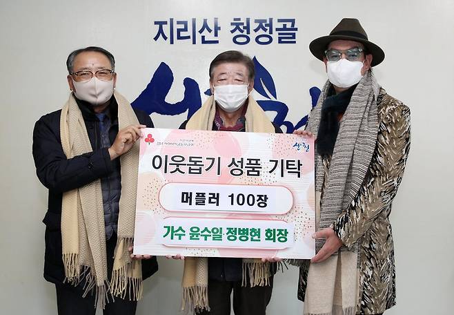 (서울=연합뉴스) 경남 산청군이 최근 군청을 찾은 가수 윤수일 씨로부터 지역 내 저소득 가구 등을 위한 머플러 100장을 전달받았다고 7일 밝혔다.