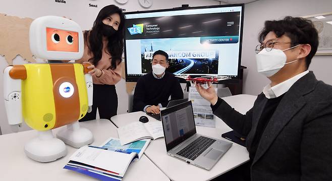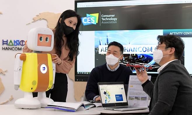 국제전자제품박람회 2021(CES 2021)이 사상 처음으로 온라인 개최되며 참가 기업들이 새로운 전시방식에 대한 막바지 점검에 한창이다. 7일 경기도 성남시 한컴 그룹에서 직원들이 전시에 출품하는 인공지능 로봇, 드론 운영 플랫폼 등을 점검하고 있다.