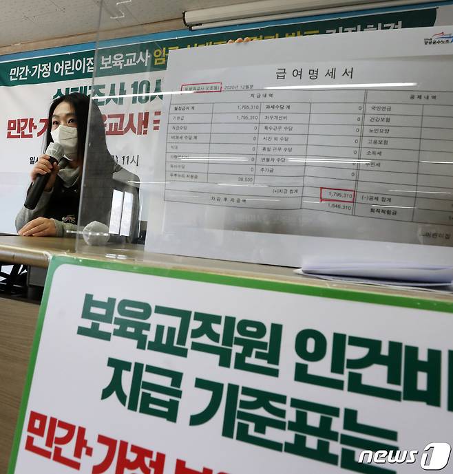 (서울=뉴스1) 오대일 기자 = 민주노총 공공운수노조 조합원들이 7일 서울 중구 민주노총 대회의실에서 열린 '민간·가정어린이집 보육교사 임금 실태조사 기자회견'에서 민간·가정어린이집 보육교사 처우 개선을 촉구하고 있다. 공공운수노조는 이 자리에서 전국 12,233명이 참여한 임금 실태조사 결과, 민간·가정어린이집 보육교사 10명 중 9명의 급여가 최저임금 수준에 그치고 있다고 주장했다. 2021.1.7/뉴스1