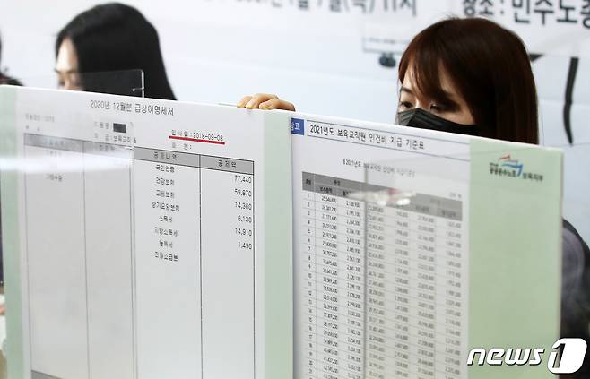 (서울=뉴스1) 오대일 기자 = 민주노총 공공운수노조 조합원들이 7일 서울 중구 민주노총 대회의실에서 열린 '민간·가정어린이집 보육교사 임금 실태조사 기자회견'에서 민간·가정어린이집 보육교사 처우 개선을 촉구하고 있다. 공공운수노조는 이 자리에서 전국 12,233명이 참여한 임금 실태조사 결과, 민간·가정어린이집 보육교사 10명 중 9명의 급여가 최저임금 수준에 그치고 있다고 주장했다. 2021.1.7/뉴스1
