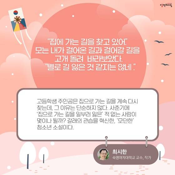 그림에 구상화와 추상화가 있듯이, 이야기에도 줄거리가 선명한 것과 흐릿한 것이 있다. 선이 굵고 변화무쌍해야 이야기답다고 여길지 모르나, 그런 이야기도 인물의 행위 동기나 사건의 인과관계는 한가지로만 해석되지 않는다. 사물은 생각보다 분명하지 않으므로, 반대로 줄거리선을 지우고 인과관계에 빈틈을 만들어놓은 이야기가 보다 사실적일 수도 있다. 이야기의 근대화는 바로 그러한 경향이 확산되는 과정이다. 그런데도 소설, 특히 청소년 소설에 대한 고정관념 가운데 하나는, ‘전개가 분명 하며 기대를 만족시켜야 한다’는 것이다. 이 소설은 그런 전근대적인 생각을 거부한다. 고등학생 주인공은 집으로 가는 길을 계속 바꾸고 다시 찾는데, 그 이유는 단순하지 않다. 지병에 시달리는 언니의 병명은 아예 밝혀지지 않으며 나중에 어떻게 되었는지도 상상에 맡겨져 있다. 하지만 사춘기에 ‘집으로 가는 길을 일부러 잃은’ 적 없는 사람이 몇이나 될까? 갈래의 관습을 혁신한, ‘모던한’ 청소년 소설이다.