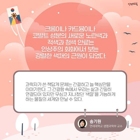 아름다운 예술작품을 보면서 과학을 생각하는 사람은 드물 것이다. 그러나 예술작품은 우리가 색을 볼 수 있기에 아름답게 보이고 또 색으로 표현되었기에 아름답다. 호모 사피엔스인 우리는 감사하게도 색을 볼 수 있다. 물체나 물질이 색깔을 띠는 원인은 빛과 물체의 상호작용에 의해 색깔이 만들어지기 때문이다. 인류는 오랜 시간 색채와 함께해왔다. 구석기 시대 인류는 이를 동굴벽화로 남겼고, 고대 이집트인은 그들만의 신성한 청색을 만들어냈다. 더 나아가 화학이 꽃을 피우던 시기에 이르러 다양한 색채의 안료는 근대 인상파의 수많은 명화를 탄생시켰고 염료는 산업의 한 축을 맡게 되었다. ‘과학과 예술의 만남’이라는 부제가 붙어있는 이 책은 유기화학 연구에 평생을 바치신 과학자가 어떻게 인류의 역사에서 예술작품 속 다양한 ‘색채’를 표현하는 방법이 개발되고 그 안에 숨어있는 색을 내는 화학적 성분들은 무엇인지 설명한 책이다. 과학자가 쓴 책답게 문체는 간결하고 늘 핵심만을 이야기한다. 그 간결함 속에서 우리는 삶과 긴밀히 연결되어 있지만 무심코 지나쳤던 ‘색깔’을 가능하게 하는 물질의 세계와 만날 수 있다.