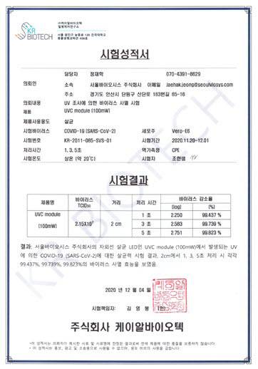 서울바이오시스 관계자는 “광출력 100밀리와트(mW) 모듈로 2㎝ 거리에서 테스트한 결과”라며 “전문시험기관에서 살균력을 인정받았다는 데 의미가 있다”고 전했다.