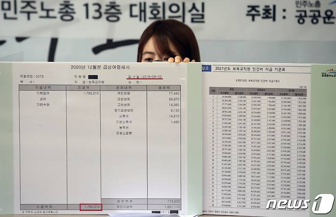 (서울=뉴스1) 오대일 기자 = 민주노총 공공운수노조 조합원들이 7일 서울 중구 민주노총 대회의실에서 열린 '민간·가정어린이집 보육교사 임금 실태조사 기자회견'에서 민간·가정어린이집 보육교사 처우 개선을 촉구하고 있다. 공공운수노조는 이 자리에서 전국 12,233명이 참여한 임금 실태조사 결과, 민간·가정어린이집 보육교사 10명 중 9명의 급여가 최저임금 수준에 그치고 있다고 주장했다. 2021.1.7/뉴스1