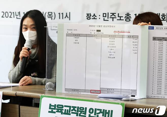 (서울=뉴스1) 오대일 기자 = 민주노총 공공운수노조 조합원들이 7일 서울 중구 민주노총 대회의실에서 열린 '민간·가정어린이집 보육교사 임금 실태조사 기자회견'에서 민간·가정어린이집 보육교사 처우 개선을 촉구하고 있다. 공공운수노조는 이 자리에서 전국 12,233명이 참여한 임금 실태조사 결과, 민간·가정어린이집 보육교사 10명 중 9명의 급여가 최저임금 수준에 그치고 있다고 주장했다. 2021.1.7/뉴스1