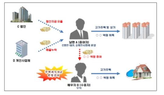 과세당국은 B의 남편 C가 자신이 운영하는 법인의 자금을 유출하고 개인사업체의 매출도 누락한 자금으로 고가 주택과 상가를 사들이고, 아내의 주택 취득자금도 증여한 것으로 의심하고 있다.