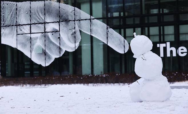 A snowman can be seen in front of the Sejong Center for the Performing Arts in Seoul.