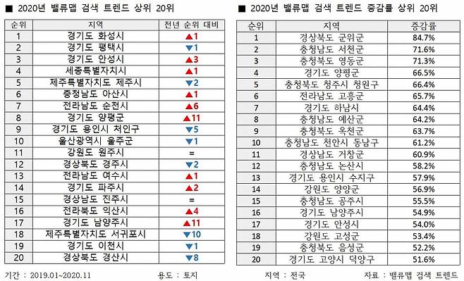 토지건물 빅데이터 플랫폼 밸류맵은 7일 자사 웹사이트 및 앱 사용자(연인원 600만 명)의 누적 이용 데이터 7억 건을 분석해 발표한 ‘2020 토지시장 트렌드 동향’ 보고서를 통해 이같이 밝혔다.