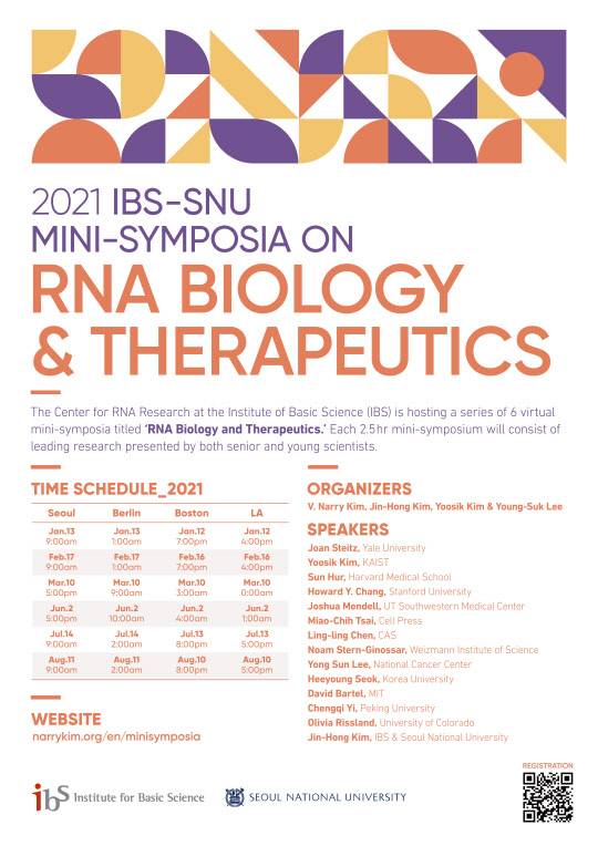 기초과학연구원(IBS) RNA 연구단(단장 김빛내리)과 서울대 생명과학부는 '2021 IBS-SNU RNA 미니 심포지아'를 온라인으로 연다고 7일 밝혔다.