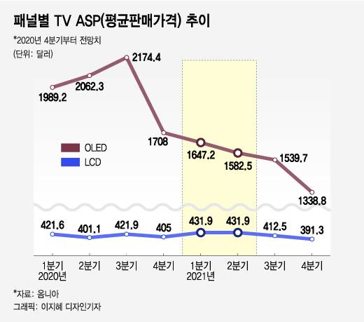 옴디아는 올 1분기 OLED TV ASP가 블랙프라이데이 등 대규모 쇼핑 이벤트가 몰린 지난해 4분기(1708달러)보다 낮은 1647.2달러를 기록할 것으로 내다봤다. 올 4분기엔 1338.8달러로 더 떨어질 전망이다.