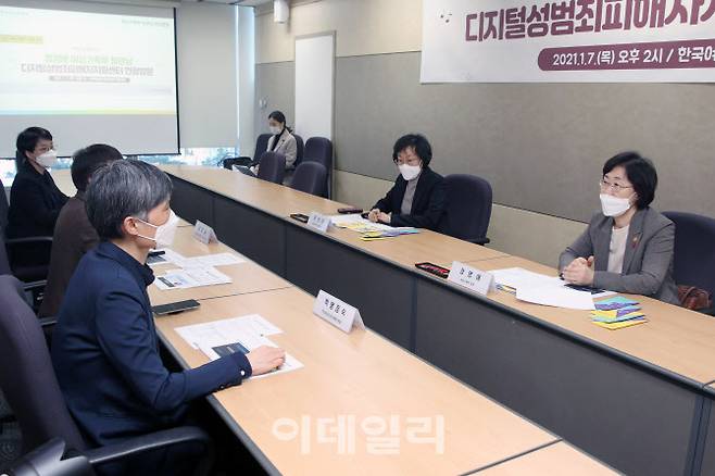 [이데일리 김태형 기자] 정영애(오른쪽) 여성가족부 장관이 7일 서울 서소문로 한국여성인권진흥원 디지털성범죄 피해자 지원센터를 방문해 관계자들과 간담회에서 인사말을 하고 있다.