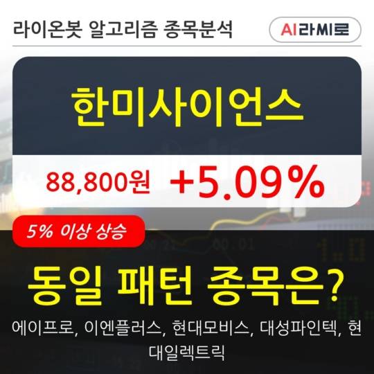 이 시각 거래소에서 한미사이언스 이외에도 에이프로(14.27%), 이엔플러스(6.44%), 현대모비스(7.94%), 대성파인텍(29.91%), 현대일렉트릭(6.74%) 등이 상승세를 보이고 있다.