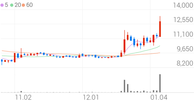 전일 대비 29.96% 상승한 14,750원에 거래되고 있다.