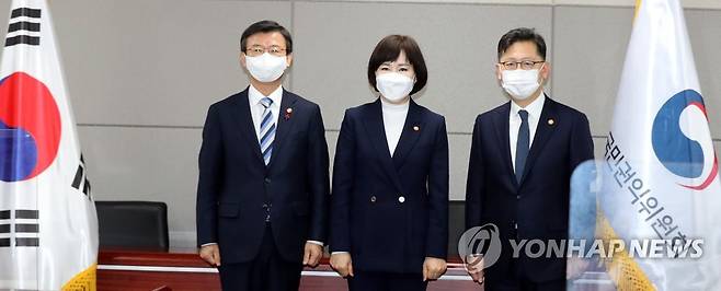 (서울=연합뉴스) 백승렬 기자 = 전현희 국민권익위원회 위원장(가운데)이 7일 정부서울청사 국민권익위원회를 방문한 김현수 농림축산식품부 장관(오른쪽)·문성혁 해양수산부 장관과 기념 촬영을 하고 있다. 농림부와 해수부는 코로나19 장기화에 따른 농림수산업계 경영애로 해소 및 명절소비 진작을 위한 청탁금지법 선물가격의 일시 상향을 권익위에 요청했다. 2021.1.7
