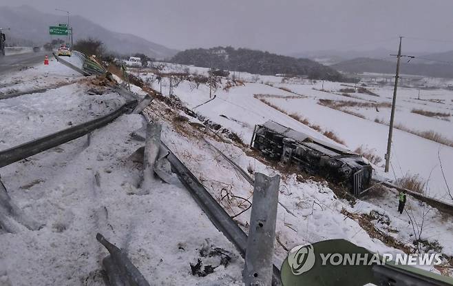 (남원=연합뉴스) 폭설이 내린 7일 오전 9시 25분께 전북 남원시의 한 도로를 달리던 25t 화물차가 전도돼 1명이 구조됐다. 2021.1.7 [전북소방본부 제공. 재판매 및 DB 금지]