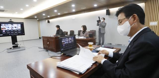 박성수 송파구청장이 7일 오후 서울 송파구청 기획상황실에서 ‘목민관클럽 제13차 온라인 정기포럼'에 참석해 토론하고 있다.