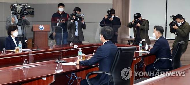 (서울=연합뉴스) 백승렬 기자 = 전현희 국민권익위원회 위원장이 7일 정부서울청사 국민권익위원회를 방문한 김현수 농림축산식품부 장관·문성혁 해양수산부 장관과 함께 설의 청탁금지법 선물가격 상향에 관해 논의하고 있다. 2021.1.7