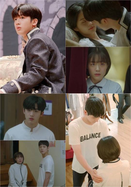 이런 가운데 카카오M은 오늘(7일) 오후 5시 카카오TV를 통해 공개되는 5회에 앞서, 연극제에서 로미오로 분장한 차헌의 꽃미남 비주얼과 함께 신솔이-우대성의 설렘 가득 스킨십을 공개해 호기심을 낳고 있다. 유럽 귀족 의상을 입은 차헌은 평소 교복 차림과는 또다른 ‘고급미’를 발산하며 눈길을 사로잡는다. 그런 가운데 차헌이 연극제에서 줄리엣 역을 맡은 ‘오희지(박지원 분)’에게 가까이 다가가며 금방이라도 키스를 나눌 듯한 모습이 사진에서 포착됐다. 마치 명화 속 한 장면 같은 키스 1초 전 모습이 시선을 강탈하는 가운데, 신솔이는 무대 뒤에서 안타까운 듯 서글픈 표정을 짓고 있어 극중에서 그녀가 과연 어떤 반응을 보일 것인지 궁금증을 높이고 있다.