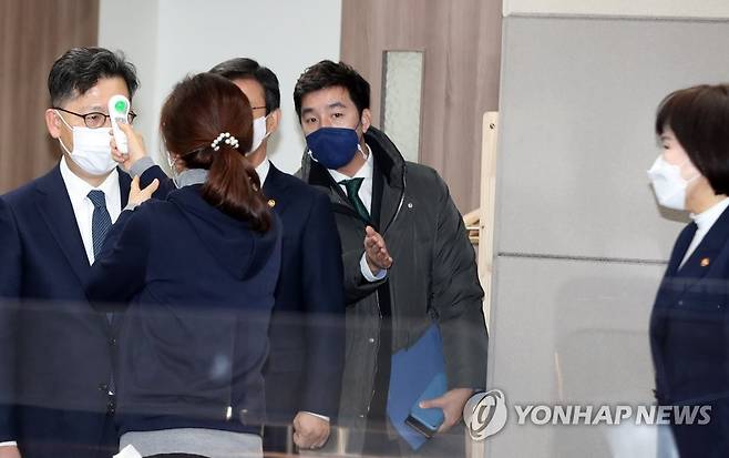 (서울=연합뉴스) 백승렬 기자 = 김현수 농림축산식품부 장관이 7일 정부서울청사 국민권익위원회를 방문, 체온을 체크하고 있다. 오른쪽 전현희 국민권익위원회 위원장. 2021.1.7