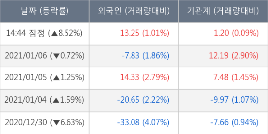 14시 44분 잠정집계에 따르면, 씨아이에스는 외국인과 기관이 각각 13.25만 주, 12,000주를 순매수 중이다. 기관 중에 투자신탁과 은행의 자금이 유입되었다.