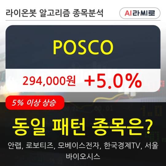 이 시각 거래소에서 POSCO 이외에도 안랩(13.29%), 로보티즈(6.69%), 모베이스전자(8.35%), 한국경제TV(6.21%), 서울바이오시스(12.73%) 등이 상승세를 보이고 있다.