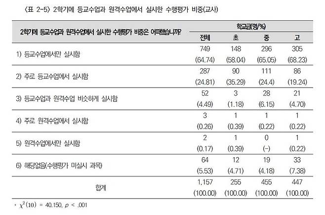지난해 코로나19 유행으로 원격수업과 등교수업을 병행한 가운데 "등교수업 때에만 수행평가를 실시했다"는 교사가 65%에 달했다.