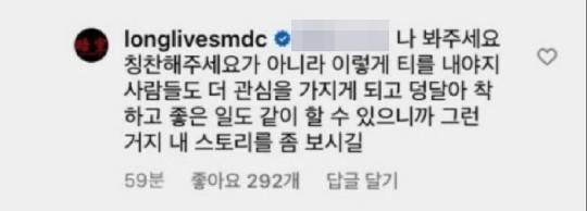 이에 쌈디는 "나 봐주세요 칭찬해주세요가 아니라 이렇게 티를 내야지 사람들도 더 관심을 가지게 되고 덩달아 착하고 좋은 일도 같이 할 수 있으니까 그런 거다"라면서 "내 스토리를 좀 보라"고 일침을 남겼다.