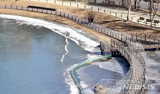 [대구=뉴시스] 이무열 기자 = 대구에 한파경보가 발효된 7일 오후 대구 수성구 두산동 수성못 곳곳이 얼어 있다. 2021.01.07. lmy@newsis.com