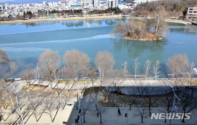 [대구=뉴시스] 이무열 기자 = 대구에 한파경보가 발효된 7일 오후 대구 수성구 두산동 수성못 곳곳이 얼어 있다. 2021.01.07. lmy@newsis.com
