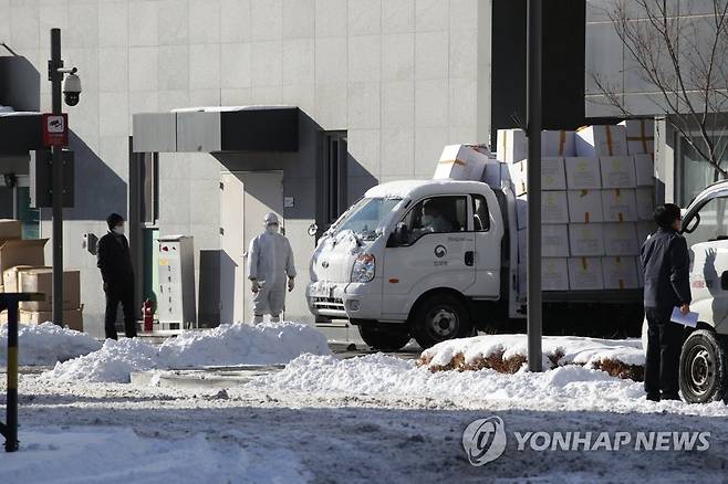 (서울=연합뉴스) 박동주 기자 = 7일 오후 서울 동부구치소에서 의료폐기물 전용 용기를 실은 트럭이 나오고 있다.