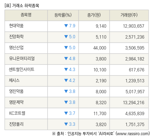 [fnRASSI]장마감, 거래소 하락 종목(현대약품 -7.9% ↓)