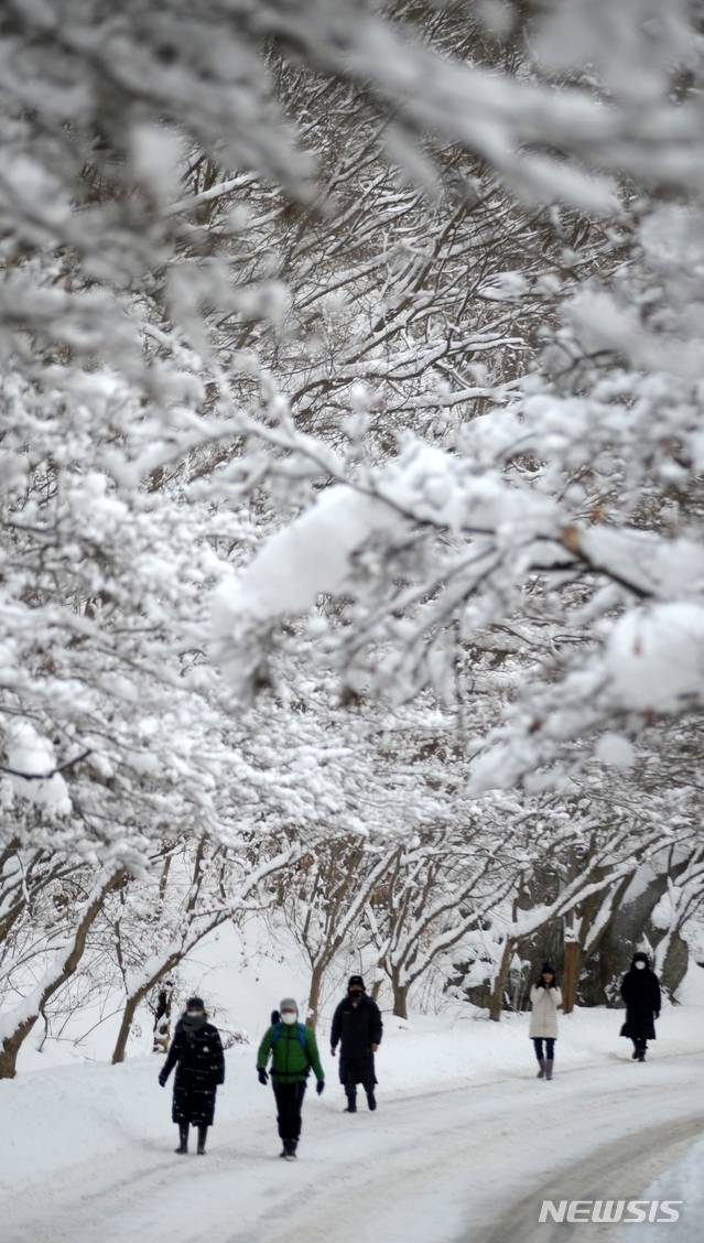 [정읍=뉴시스] 김얼 기자 = 전북지역에 많은 양의 눈이 내린 7일 정읍시 내장산국립공원을 찾은 관광객들이 산책로를 걸으며 겨울을 즐기고 있다. 2021.01.07.