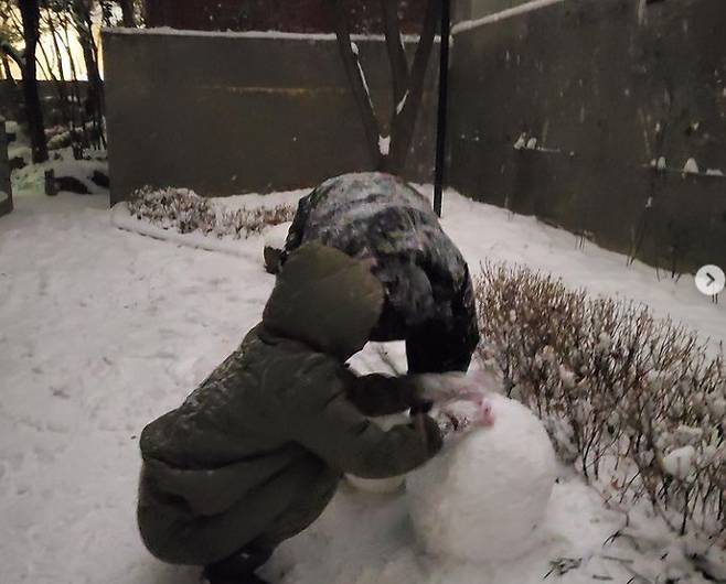 사진에는 백지영, 정석원 부부가 눈을 맞으며 커다란 눈사람을 만들고 있는 장면이 담겼다.