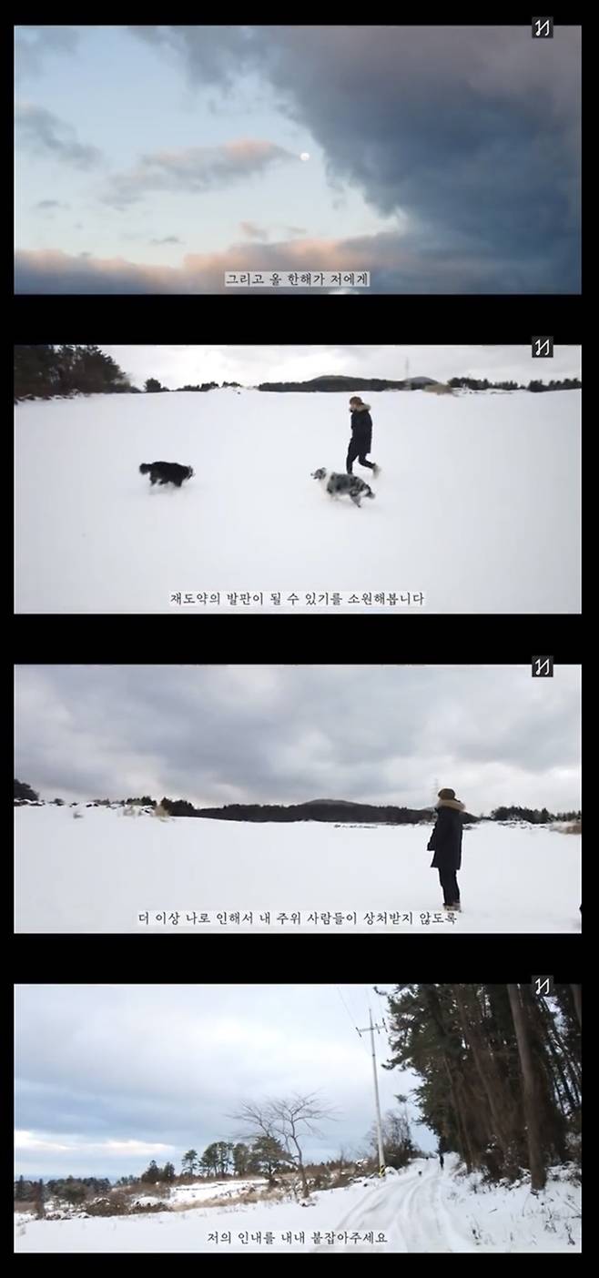 김현중은 “여기는 제주도다. 아는 삼촌의 펜션인데 올 때마다 집처럼 쓰고 있다. 음악도 만들고 강아지도 산책하면서 제주도에서 머물고 있다”라고 근황을 알렸다. 그는 반려견 두 마리, 유튜브PD와 함께 꼭두새벽부터 쌓인 눈을 헤치고 해를 맞으러 나갔다. 흐린 날씨 때문에 일출을 보지는 못했지만 김현중은 제주도의 그림같은 설경을 담은 영상에 내레이션으로 신축년 새해 소원을 말했다.