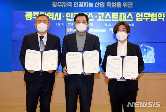 [광주=뉴시스] 송창헌 기자 = 이용섭 광주시장(가운데)이 7일 오후 시청 비즈니스룸에서 박진 ㈜인포렉스 대표이사, 이선관 ㈜고스트패스 대표이사와 인공지능 기반 산업육성 업무협약을 체결한 후 기념촬영을 하고 있다. (사진=광주시 제공) 2021.01.07 photo@newsis.com