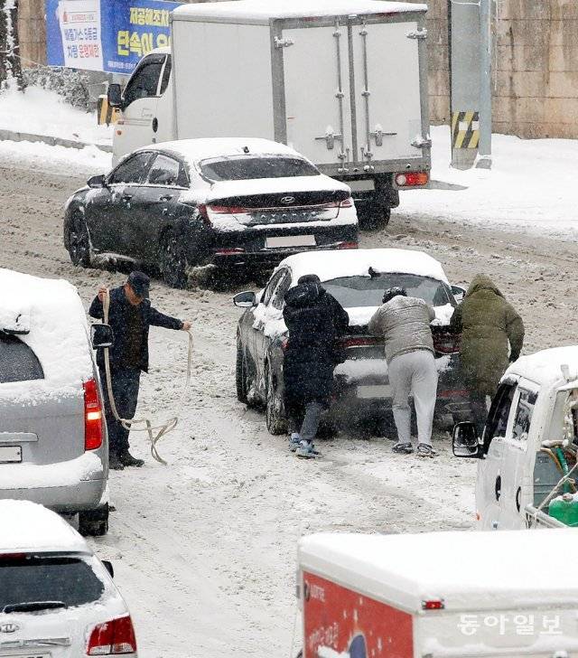 폭설이 내린 7일 광주시 북구 동림동 한 언덕길이 빙판길로 변해 차량들이 멈춰서자 운전자들이 내려 힘을 합쳐 차량을 밀고 있다.