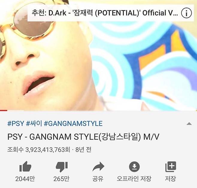 사진 속 조회수는 ‘3,923,413,763회’로 읽기조차 힘들 만큼 어마어마하다. 노래가 발매된 2012년부터 지금까지 공개된 이 뮤직비디오는 말춤과 유쾌한 영상미로 꾸준히 인기를 얻었다. 이미 전 세계 인구의 절반을 넘긴 조회수가 어디까지 올라갈지 기대가 모아진다.