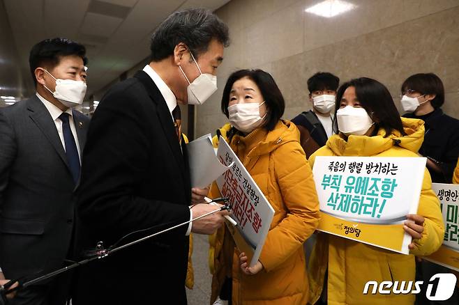 (서울=뉴스1) 신웅수 기자 = 심상정 의원을 비롯한 정의당 의원들이 7일 오후 서울 여의도 국회에서 열린 더불어민주당 의원총회 회의장 앞에서 이낙연 대표에게 '온전한 중대재해기업처벌법' 제정을 촉구하며 피케팅을 하고 있다. 2021.1.7/뉴스1