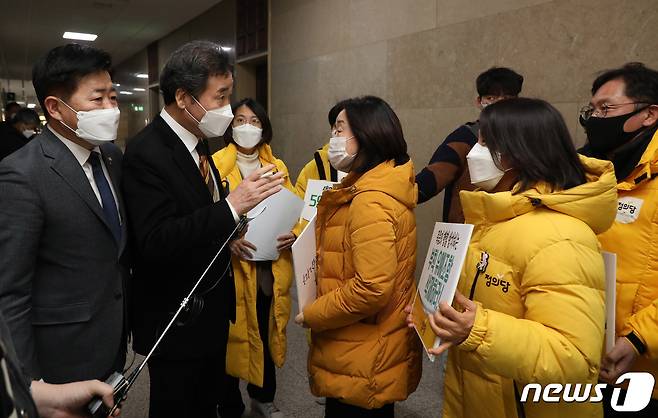 (서울=뉴스1) 신웅수 기자 = 심상정 의원을 비롯한 정의당 의원들이 7일 오후 서울 여의도 국회에서 열린 더불어민주당 의원총회 회의장 앞에서 이낙연 대표에게 '온전한 중대재해기업처벌법' 제정을 촉구하며 피케팅을 하고 있다. 2021.1.7/뉴스1