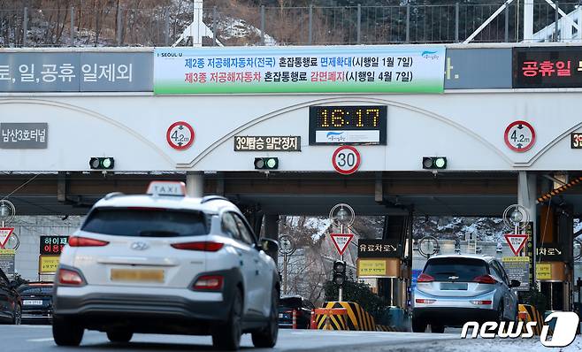 (서울=뉴스1) 구윤성 기자 = 7일 오후 서울 중구 남산3호터널 요금소에 저공해차량 혼잡통행료 면제 관련 현수막이 설치돼 있다. 서울시는 '서울특별시 혼잡통행료 징수 조례' 일부 개정을 통해 이날부터 제2종 저공해자동차(하이브리드·플러그인하이브리드)에 대해 등록지 및 서울시 발부스티커와 관계없이 서울 지역내 혼잡통행료를 면제한다. 제3종 저공해자동차와 배출가스저감장치(DPF·DOC) 부착 경유차가 받아온 혼잡통행료 50% 감면 혜택은 개정 조례 공포 후 3개월의 유예기간을 거쳐 폐지된다. 2021.1.7/뉴스1