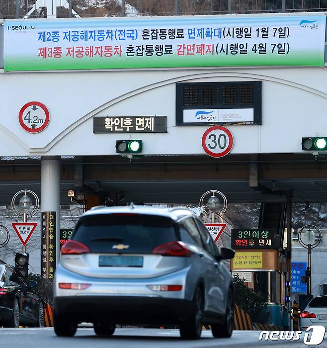 (서울=뉴스1) 구윤성 기자 = 7일 오후 서울 중구 남산3호터널 요금소에 저공해차량 혼잡통행료 면제 관련 현수막이 설치돼 있다. 서울시는 '서울특별시 혼잡통행료 징수 조례' 일부 개정을 통해 이날부터 제2종 저공해자동차(하이브리드·플러그인하이브리드)에 대해 등록지 및 서울시 발부스티커와 관계없이 서울 지역내 혼잡통행료를 면제한다. 제3종 저공해자동차와 배출가스저감장치(DPF·DOC) 부착 경유차가 받아온 혼잡통행료 50% 감면 혜택은 개정 조례 공포 후 3개월의 유예기간을 거쳐 폐지된다. 2021.1.7/뉴스1