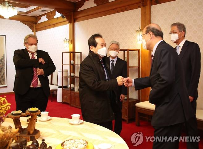 (서울=연합뉴스) 김승두 기자 = 정세균 국무총리가 7일 서울 삼청동 총리공관에서 '2021년 뉴노멀시대, 명사에게 묻다'라는 주제로 열린 제31차 목요대화에서 제프리 존스 주한미국상공회의소 이사회 회장과 조윤제 한국은행 금융통화위원회 위원 등 참석자들과 주먹인사를 하고 있다. 2021.1.7