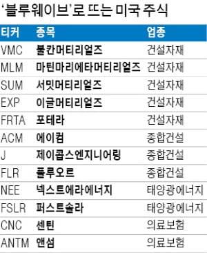 이 영향으로 건설·소재주 등이 급등했다. 미국 소재기업으로 이뤄진 ‘SPDR 소재주 선별’(XLB) 상장지수펀드(ETF)는 이날 4% 넘게 올랐다. 앤서니 페티나리 씨티그룹 애널리스트는 “인프라 확대 정책은 초당파적인 지지를 받기 쉬워 저항이 큰 기후변화나 세금 관련 정책보다 빨리 시행될 것”이라며 관련주 비중 확대를 추천했다. 씨티는 불칸, 마틴마리에타, 서밋머티리얼즈, 이글머티리얼즈, 포테라 등 건설자재 관련 소재기업을 유망주로 꼽았다. 불칸과 마틴마리에타, 서밋 등은 이날 각각 7~13% 뛰었다. 건설엔지니어링업체인 에이컴, 제이콥스엔지니어링, 플루오르도 추천받았다.