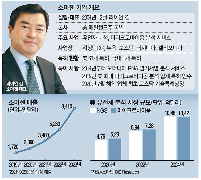 소마젠은 국내 유전체 분석 업체 마크로젠이 2004년 미국에 설립한 유전체 분석 전문 기업으로 우수한 유전자 분석 기술력을 인정받아 지난해 7월 해외 기업으로는 처음으로 코스닥시장에 기술특례상장됐다.