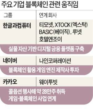 네이버와 카카오는 투자를 통해 블록체인 동맹을 꾀하고 있다. 네이버의 스타트업 양성 조직 ‘D2SFD2’는 이달 블록체인 기반 게임 엔진 스타트업 투자에 나섰다. 카카오게임즈는 지난해 12월 블록체인업체 웨이투빗의 최대주주(45.8%)에 올랐다.