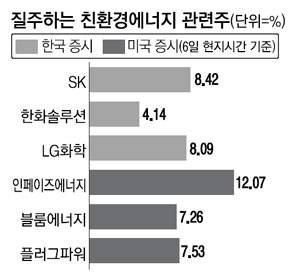 한편 7일 한국 증시에서는 테슬라 전기차 배터리 공급업체인 LG화학(8.09%)을 비롯해 SK이노베이션(2.33%)과 삼성SDI(2.65%) 주가가 눈에 띄게 올랐다. 이 밖에 7일 태양에너지 분야에 진출한 한화솔루션도 주가가 4.14% 올랐다. 앞서 뉴욕 증시에서 태양에너지 시스템 서비스 업체 인페이즈에너지 주가가 하루 만에 12.07% 뛰고 선런· 선파워 등 태양에너지 부문 기업들 주가가 치솟은 분위기가 영향을 줬다.